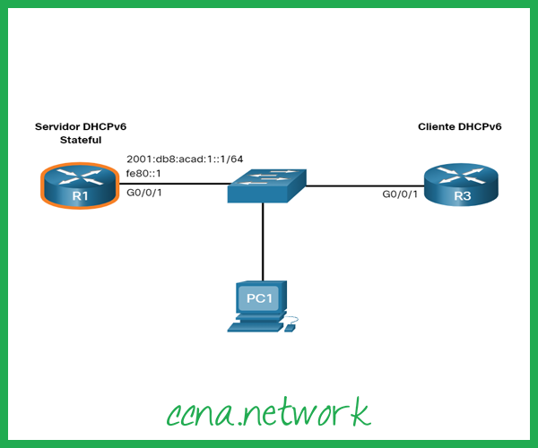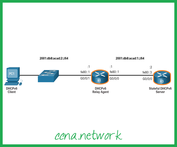 Na figura, R3 está configurado como um servidor DHCPv6 com monitoração de estado. O PC1 está na rede 2001: db8: acad: 2 :: / 64 e requer os serviços de um servidor DHCPv6 com estado para adquirir sua configuração IPv6. R1 precisa ser configurado como o agente de retransmissão DHCPv6.