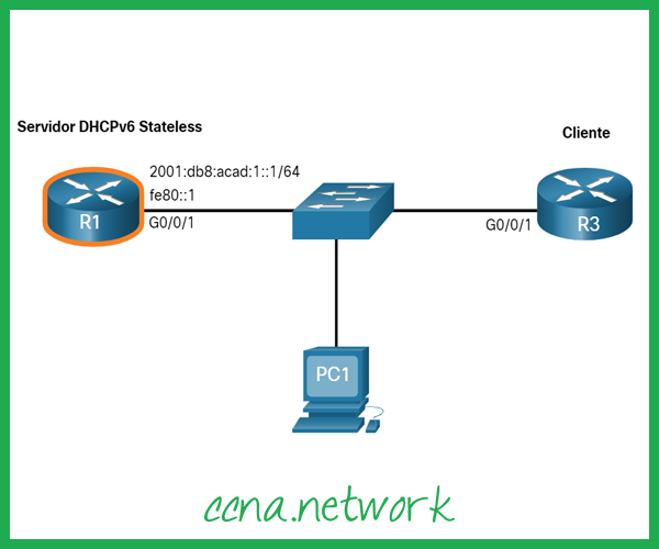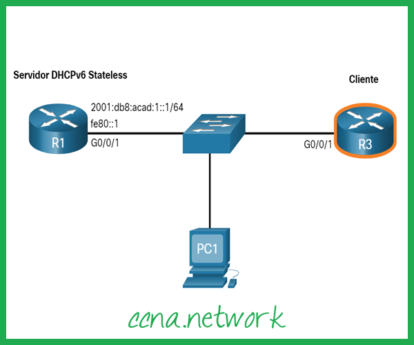 Um roteador também pode ser um cliente DHCPv6 e obter uma configuração IPv6 de um servidor DHCPv6, como um roteador funcionando como um servidor DHCPv6. Na figura, R1 é um servidor DHCPv6 sem estado.