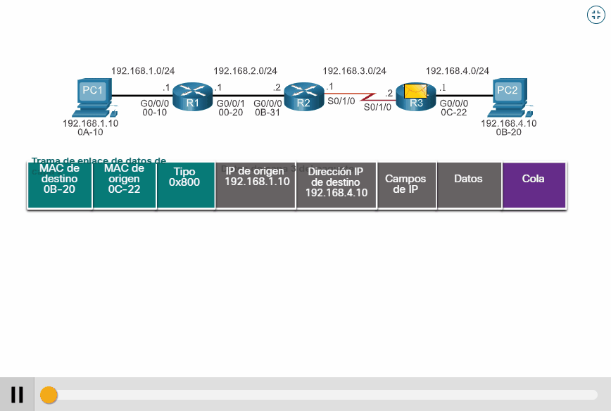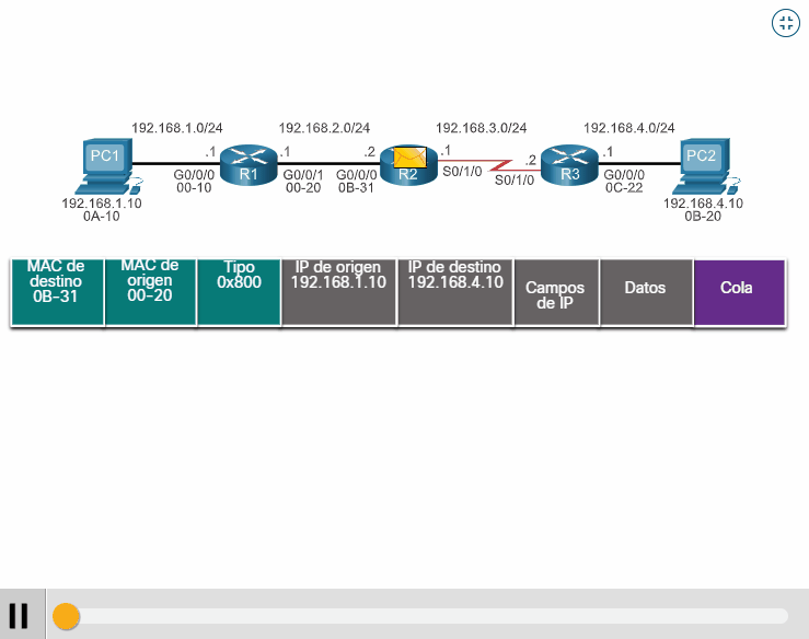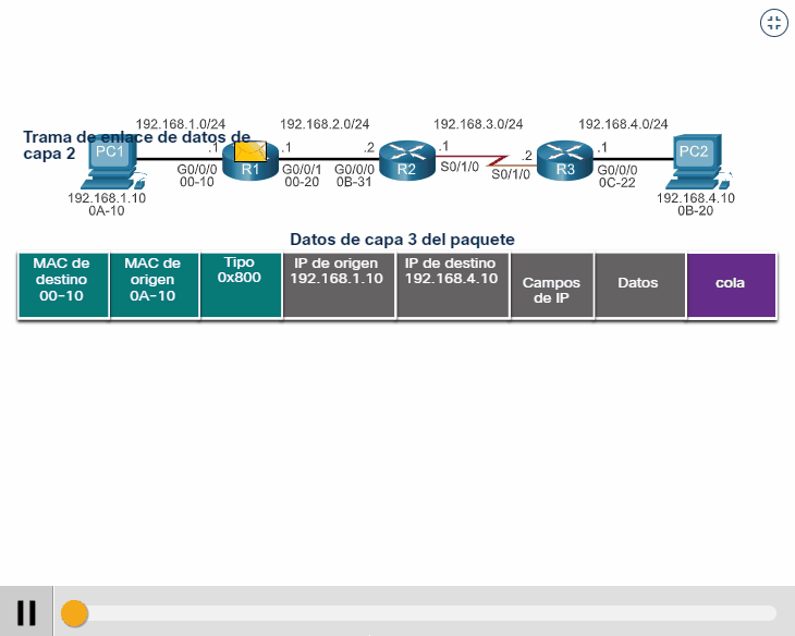 Clique em cada botão e reproduza as animações do PC1 enviando um pacote para o PC2. Observe como o conteúdo e o formato do quadro do link de dados mudam a cada salto.