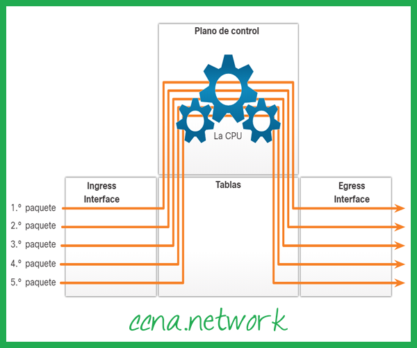 Suponha que haja um fluxo de tráfego que consiste em cinco pacotes. Todos estão indo para o mesmo destino. Clique em cada botão para obter mais informações sobre os mecanismos de encaminhamento de pacotes.