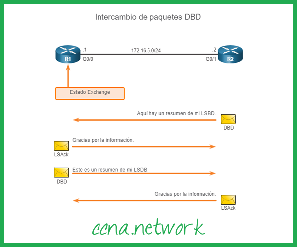 Após o estado Two-Way, os roteadores passam para os estados de sincronização do banco de dados. Enquanto o pacote Hello foi usado para estabelecer adjacências vizinhas, os outros quatro tipos de pacotes OSPF são usados durante o processo de troca e sincronização de LSDBs. Este é um processo de três etapas, como segue: