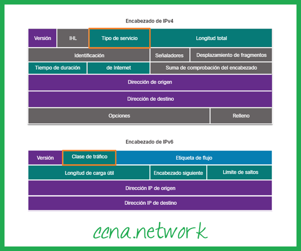 IPv4 e IPv6 especificam um campo de 8 bits em seus cabeçalhos de pacote para marcar os pacotes. Conforme mostrado na figura, IPv4 e IPv6 suportam um campo de 8 bits para marcação: o campo Tipo de serviço (ToS) para IPv4 e o campo Classe de tráfego para IPv6.