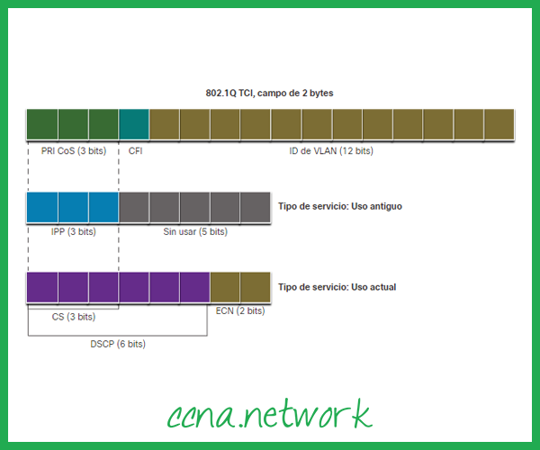 O padrão 802.1Q também inclui o esquema de priorização de QoS conhecido como IEEE 802.1p. O padrão 802.1p usa os três primeiros bits no campo Tag Control Information (TCI). Conhecido como campo de Prioridade (PRI), este campo de 3 bits identifica as marcações de Classe de Serviço (CoS). Três bits significam que um quadro Ethernet da Camada 2 pode ser marcado com um dos oito níveis de prioridade (valores 0-7) conforme exibido na figura.