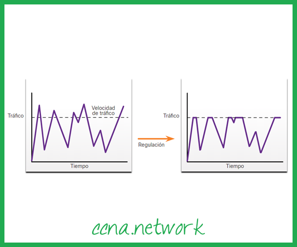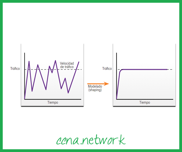 A modelagem de tráfego retém os pacotes em excesso em uma fila e, a seguir, programa o excesso para transmissão posterior em incrementos de tempo. O resultado da modelagem de tráfego é uma taxa de saída de pacote suavizada, conforme mostrado na figura.