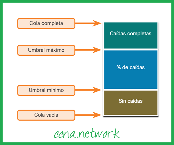 O gerenciamento de congestionamento inclui métodos de enfileiramento e agendamento em que o tráfego em excesso é armazenado em buffer ou enfileirado (e às vezes descartado) enquanto espera para ser enviado por uma interface de saída. As ferramentas de prevenção de congestionamento são mais simples. Eles monitoram as cargas de tráfego de rede em um esforço para antecipar e evitar congestionamento na rede comum e gargalos entre redes antes que o congestionamento se torne um problema. Essas ferramentas podem monitorar a profundidade média da fila, conforme representado na figura. Quando a fila está abaixo do limite mínimo, não há quedas. Conforme a fila é preenchida até o limite máximo, uma pequena porcentagem de pacotes é descartada. Quando o limite máximo é ultrapassado, todos os pacotes são descartados.