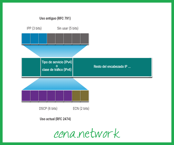 O RFC 2474 substitui o RFC 791 e redefine o campo ToS renomeando e estendendo o campo IPP. O novo campo, conforme mostrado na figura, possui 6 bits alocados para QoS. Chamados de campo Ponto de código de serviços diferenciados (DSCP), esses seis bits oferecem no máximo 64 classes de serviço possíveis. Os dois bits de notificação de congestionamento explícito de IP (ECN) restantes podem ser usados por roteadores com reconhecimento de ECN para marcar pacotes em vez de descartá-los. A marcação ECN informa aos roteadores downstream que há congestionamento no fluxo de pacotes.