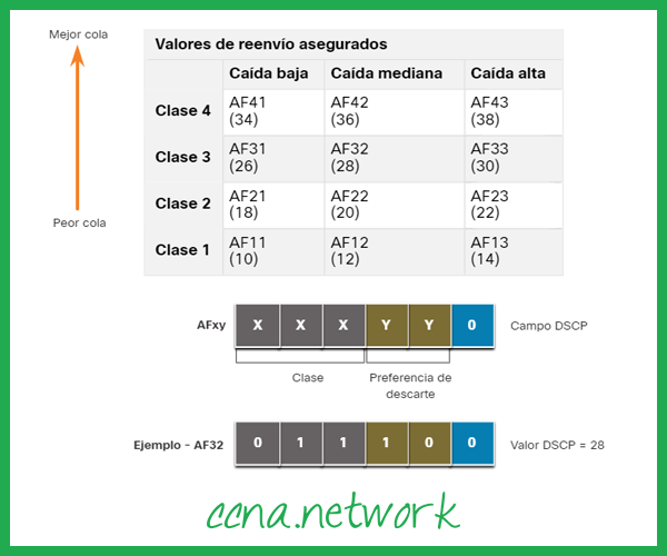 Por exemplo, AF32 pertence à classe 3 (binário 011) e tem uma preferência de queda média (binário 10). O valor DSCP completo é 28 porque você inclui o 6º bit 0 (binário 011100).