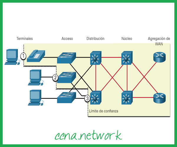 Onde as marcações devem ocorrer? O tráfego deve ser classificado e marcado tão próximo de sua origem quanto técnica e administrativamente viável. Isso define o limite de confiança, conforme mostrado na figura.